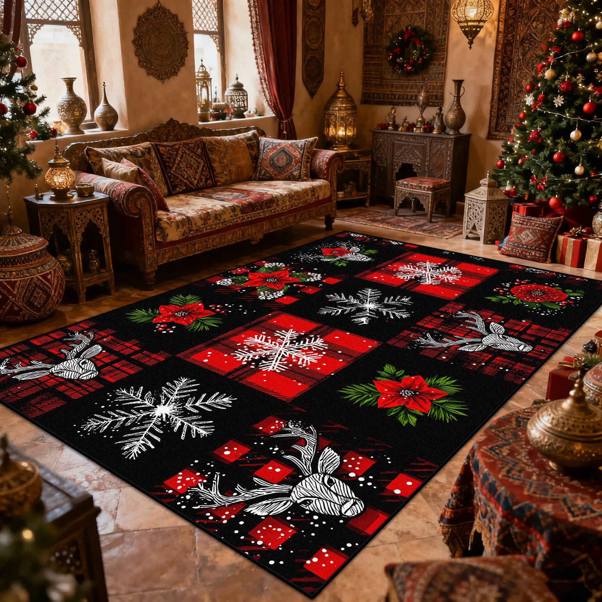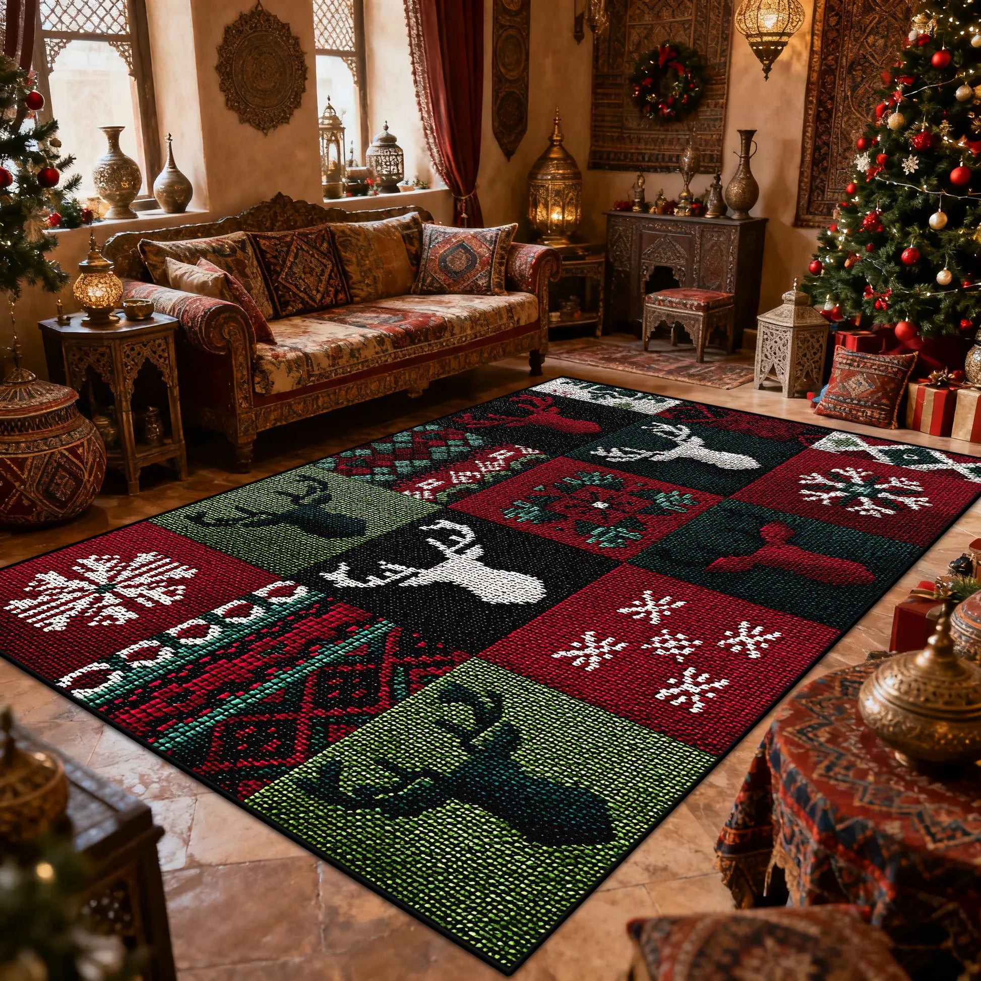 Elevate your holiday décor with this bohemian-inspired living room carpet, where eclectic artistry meets festive charm. Featuring rich, warm tones and intricate patterns characteristic of bohemian design, this carpet brings texture and visual interest to any space. Perfect for the Christmas season, it creates an inviting atmosphere while maintaining year-round versatility. The thoughtfully crafted design balances traditional bohemian aesthetics with seasonal elegance, making it an ideal choice for those seeking to infuse their living room with personality and warmth during the holidays and beyond.